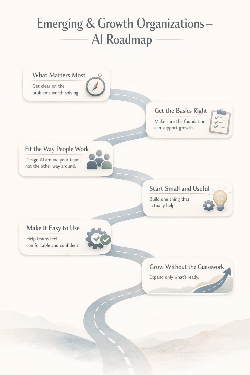 Many organizations come to AI feeling confused, overwhelmed, or unsure where to begin. The market is noisy, the promises are big, and it’s not always clear what will actually help your business.